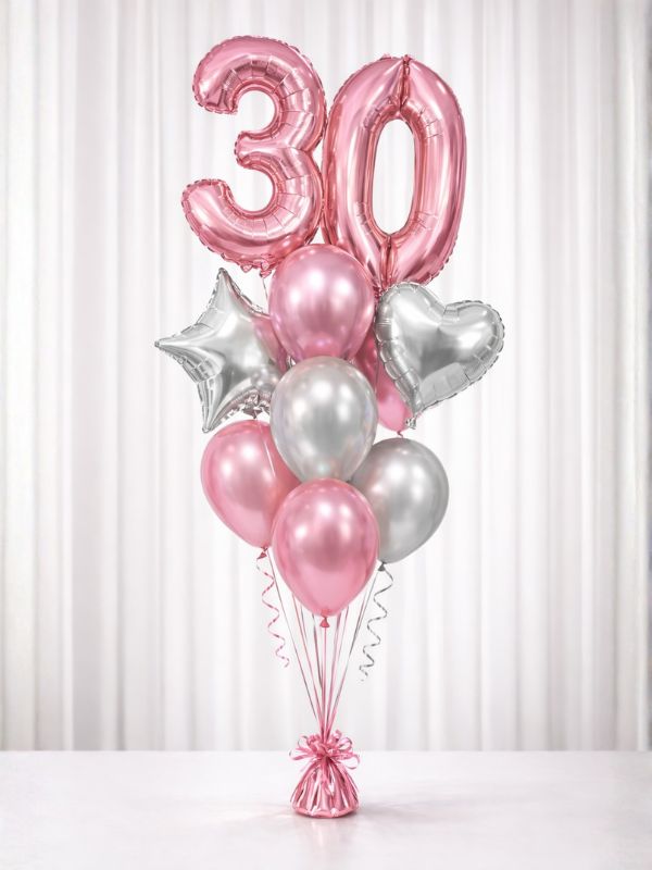 Featuring two large Megaloon number balloons, this bouquet is paired with coordinating foil and latex balloons to create a full, balanced display that floats beautifully and makes the perfect party centrepiece.